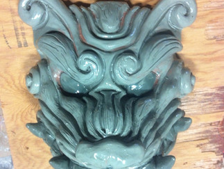 The initial sculpture was created by taking a plaster cast of my face and then building the mask up on top of the cast with oil based clay. I used a variety of Komainu statues and Japanese demon masks as inspiration.