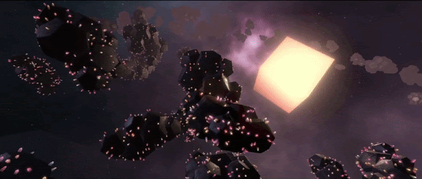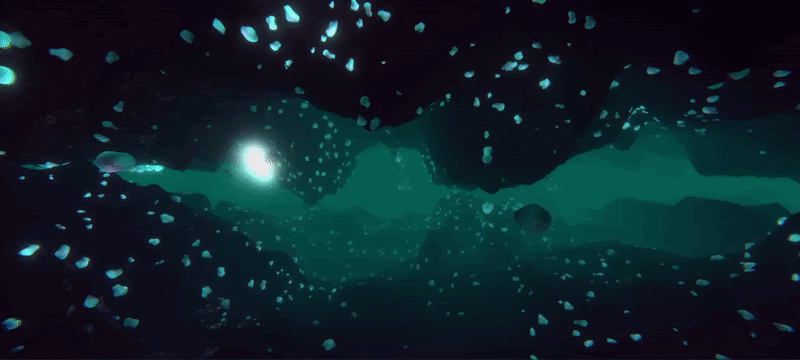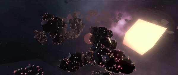 Once I was happy with the generic flocking behavior, I created three different scenes to prototype the experience. The first was inspired by the idea of an asteroid belt orbiting a planet and the flock members would follow audience members when they got near any walls. The second was inspired by schools of fish and the flock members would swim towards audience members and then merge together into larger forms when an audience member touches a wall. The third, and most complex, had a flock of large objects with flocks of smaller objects running along their surface.