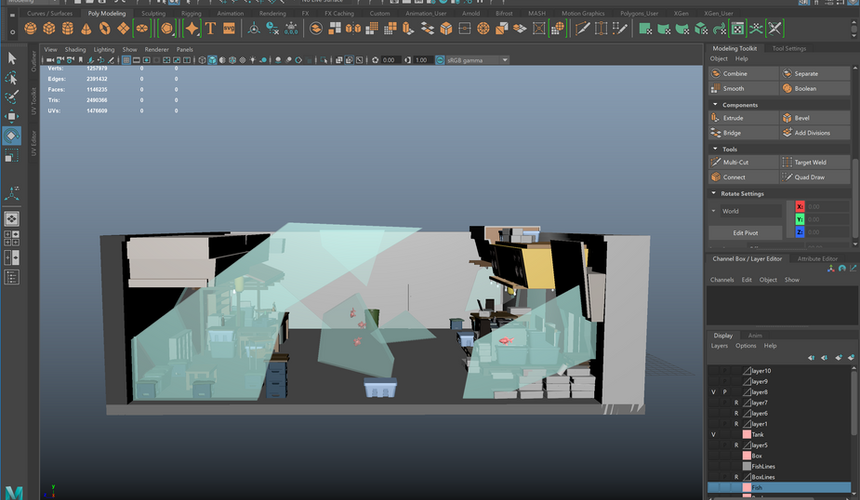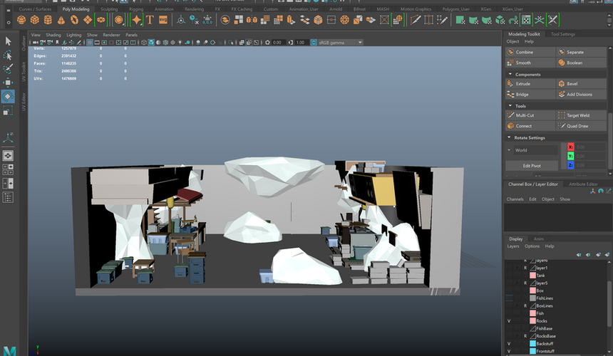 I first built a model of what the installation venure could look like in Autodesk Maya, which I imagined to be a room inspired by the appearance of Tsukiji Market stalls. To save time I tried to build a small number of models which could be duplicated to decorate the room, and for larger pieces built models which could be altered slightly to make new models.